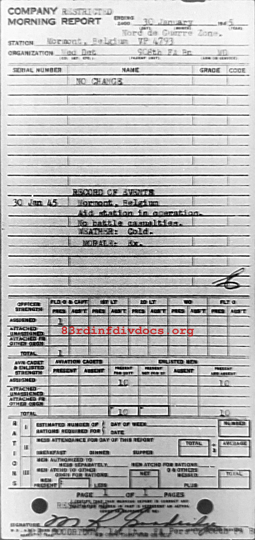 Aid station in operation. No battle casualties. Weather: Cold. Morale: Excellent.
