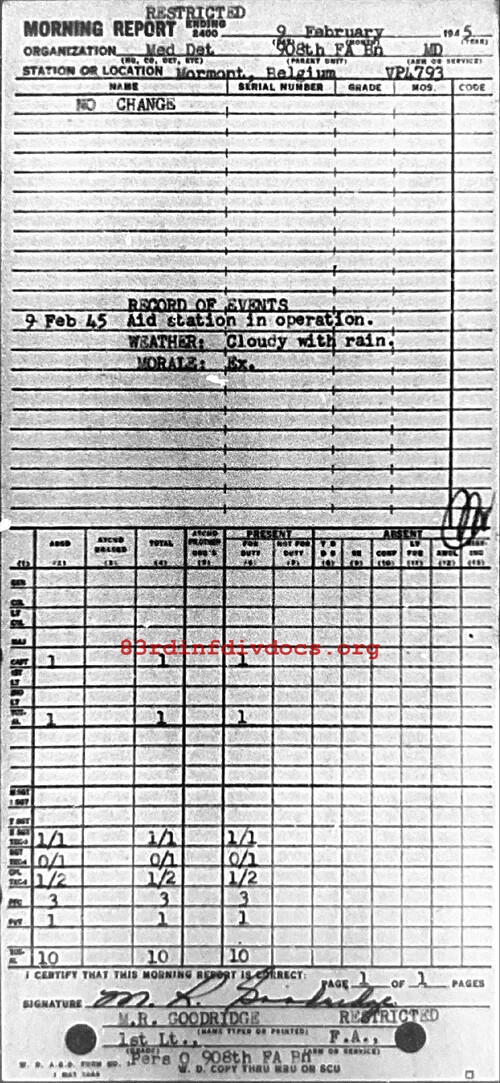 Aid station in operation. Weather: Cloudy with rain. Morale: Excellent.
