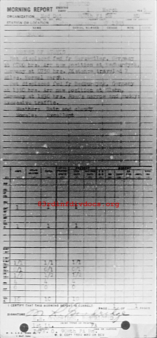 Det displaced fr Garzweiler, Germany at 0700 hrs. Arr new position at Bedburdyck, Germany at 0750 hrs. Distance traveled 7 miles. Normal march. Det displaced fwd fr Bedburdyck, Germany at 1350 hrs. Arr new position at Glehn, Germany at 1830 hrs. Roads narrow and muddy. Excessive traffic. Weather: Rain and cloudy. Morale: Excellent.
