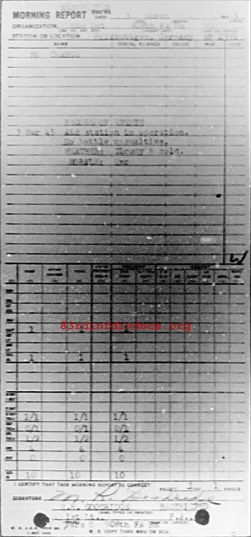 Aid station in operation. No battle casualties. Weather: Cloudy & cold. Morale: Excellent.