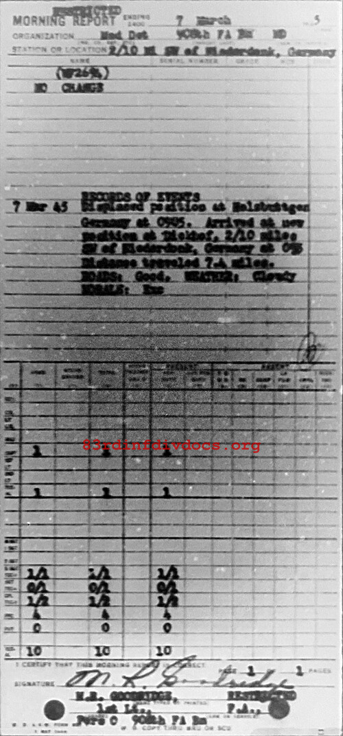 Displaced position at Holzbuttgen, Germany at 0905. Arrived at new position at Dickhof, 2/10 miles SW of Niederdonk, Germany at 0930. Distance traveled 7.4 miles. Roads: Good. Weather: Cloudy. Morale: Excellent.