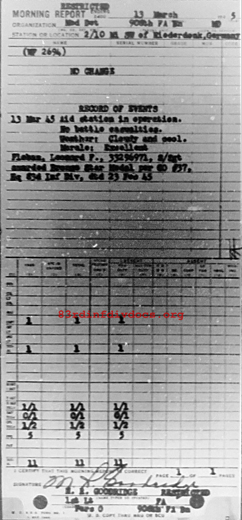 Aid station in operation. No battle casualties. Weather: Cloudy & cool. Morale: Excellent. Fleban, Leonard F, 33296971, S/Sgt awarded Bronze Star Medal per GO #37, Hq 83rd Inf Div, dtd 23 Feb 45