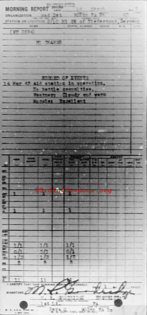 Aid station in operation. No battle casualties. Weather: Cloudy and warm. Morale: Excellent.