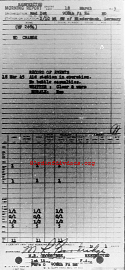 Aid station in operation. No battle casualties. Weather: Clear & warm. Morale: Excellent.