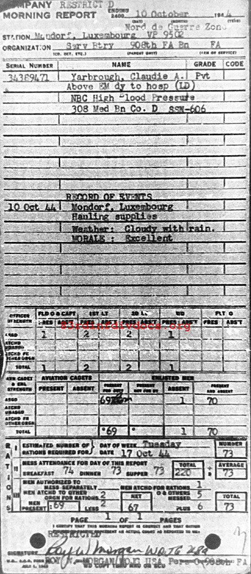 Morning report SERBTRY/908FA for October 10, 1944