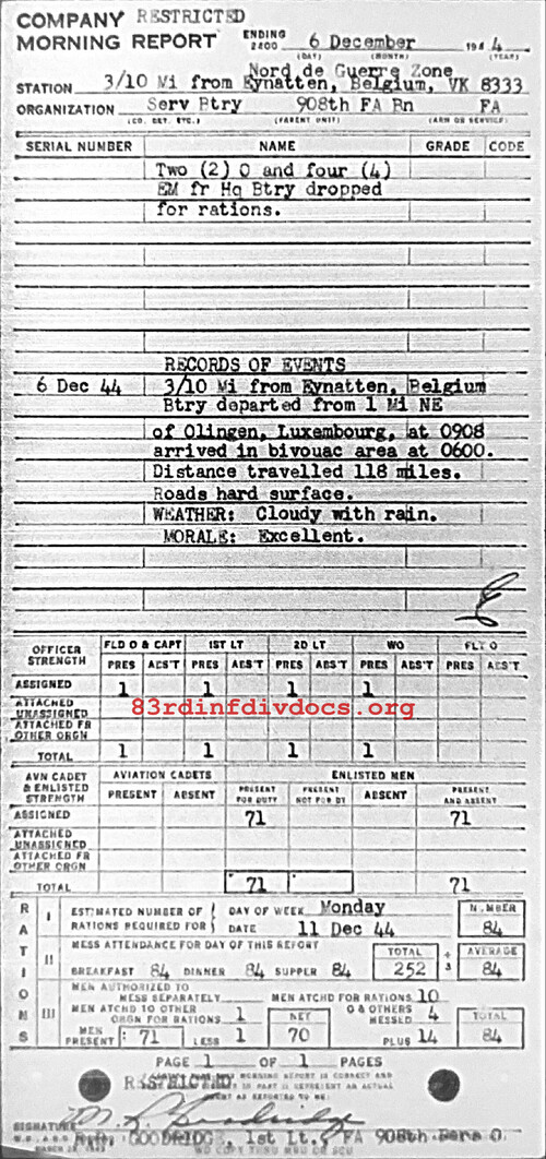 Record of events: Btry departed from 1 Mi NE of Olingen, Luxembourg, at 0908 arrived in bivouac area at 0600. Distance traveled 118 miles. Roads hard surface. Weather: Cloudy with rain. Morale: Excellent.