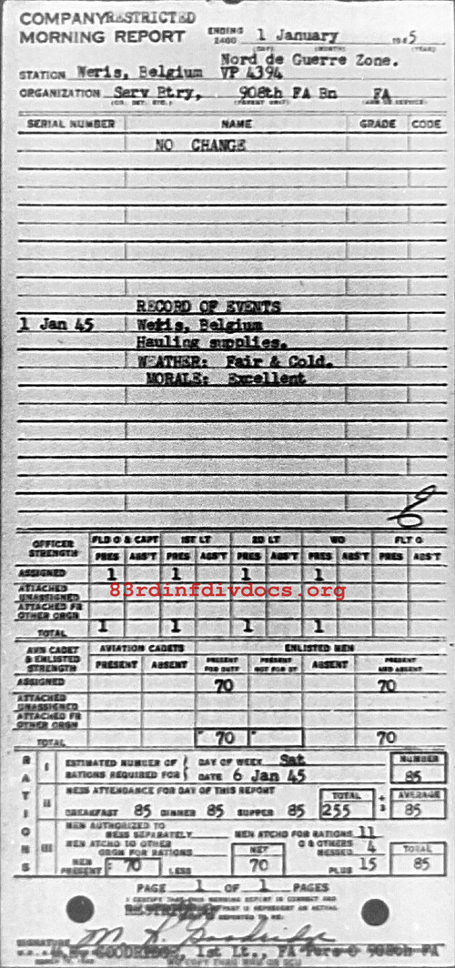 Departed from LeFourneau, Belgium at 0815 arrived at Weris, Belgium at 1030. Dis traveled 21 miles. Roads: Slippery & covered with ice. Weather: Clear & cold. Morale: Excellent.