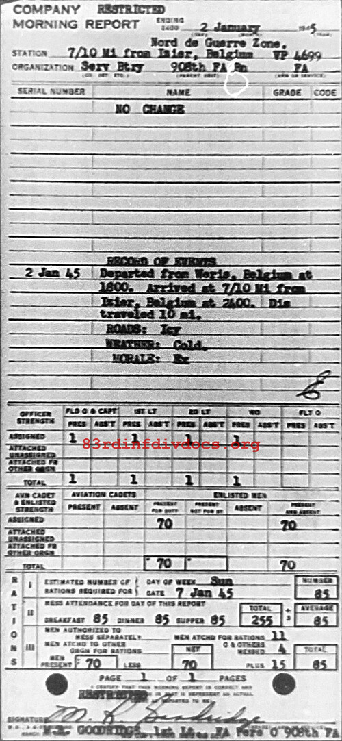 Departed from Weris, Belgium at 1800. Arrived at 7/10 Mi from Izier, Belgium at 2400. Dis traveled 10 mi. Roads: Icy. Weather: Cold. Morale: Excellent.