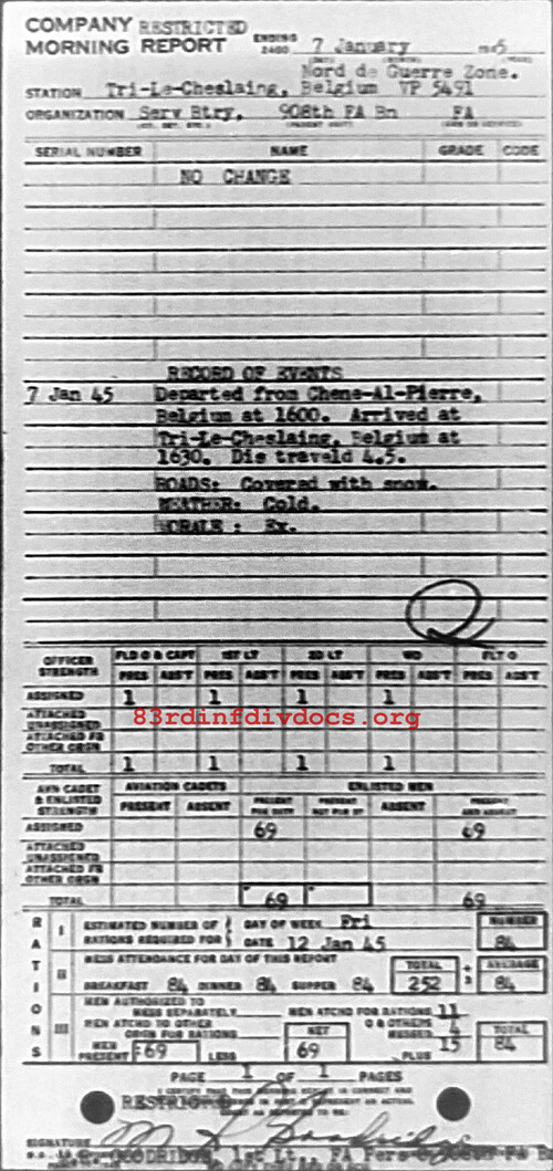 Departed from Chene-Al-Pierre, Belgium at 1600. Arrived at Tri-le-Cheslaing, Belgium at 1630. Dis traveled 4.5. Roads: Covered with snow. Weather: Cold. Morale: Excellent.