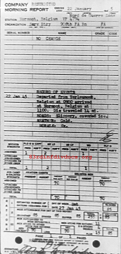 Departed from Verleumont, Belgium at 0900 arrived at Mormont, Belgium at 1100. Dis traveled 14 mi. Roads: Slippery, covered ice. Weather: Cold. Morale: Excellent.