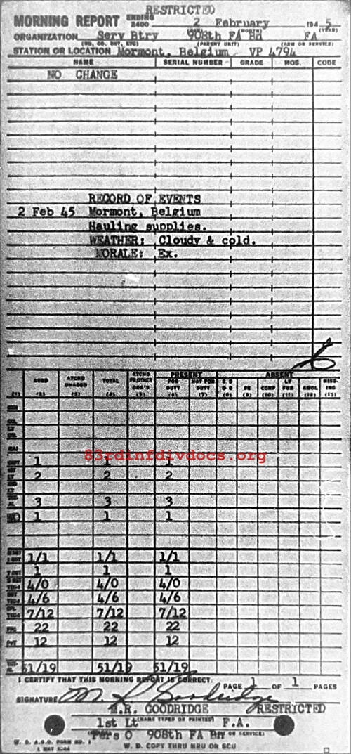 Morning report SERBTRY/908FA for February 2, 1945