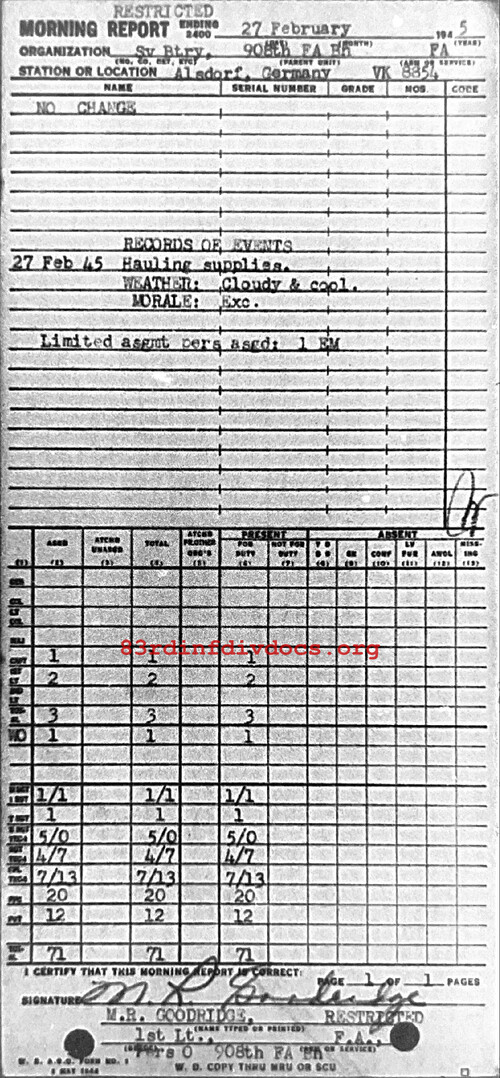 Morning report SERBTRY/908FA for February 27, 1945