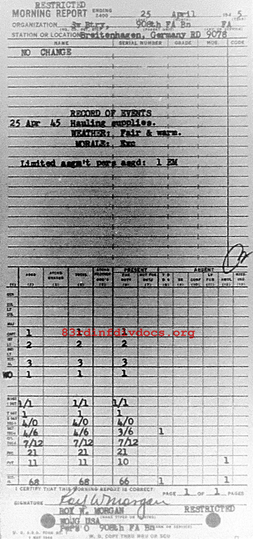Morning report SERBTRY/908FA for April 25, 1945