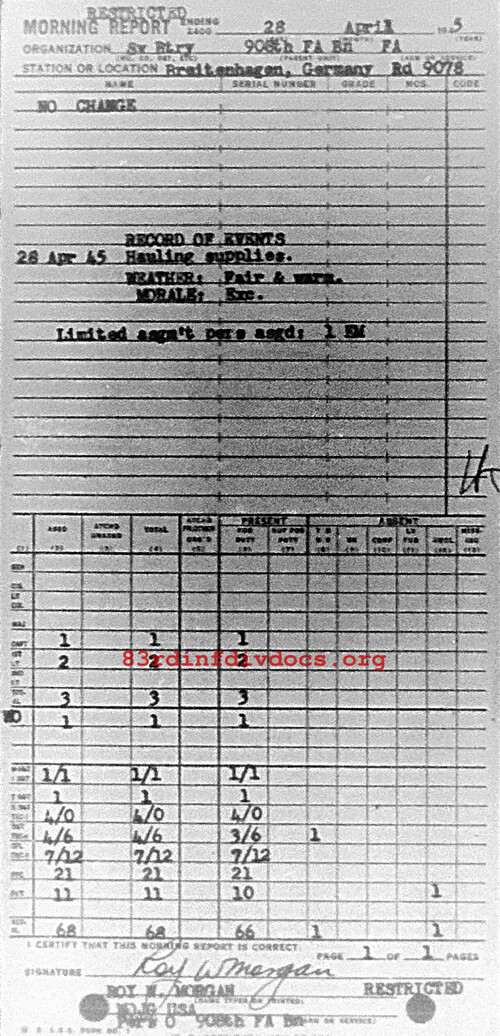 Morning report SERBTRY/908FA for April 28, 1945