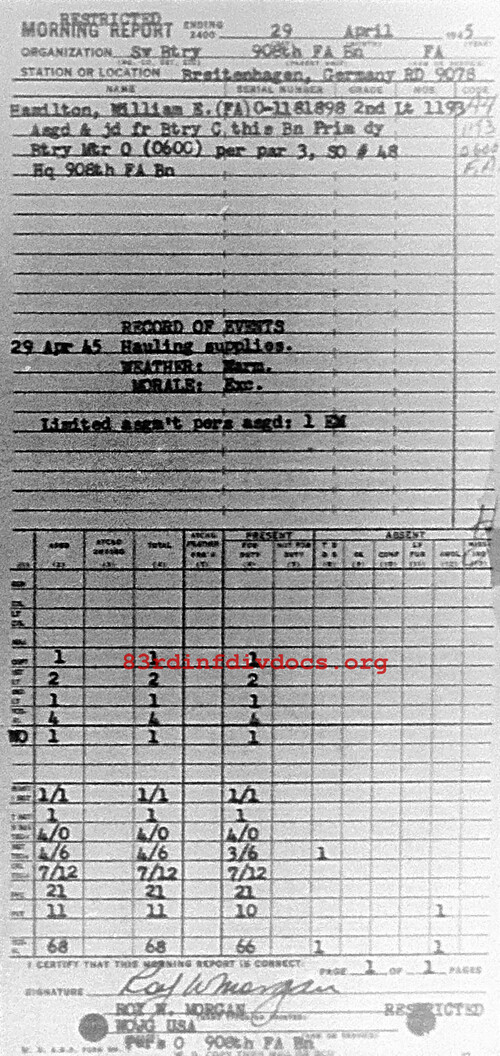 Morning report SERBTRY/908FA for April 29, 1945